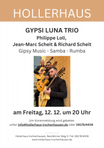 12. Dezember um 20:00GYPSI LUNA TRIO Philippe Loli, Jean-Marc Scheit & Richard Scheit Gipsy Music – Samba – Rumba am Freitag, 12. 12. um 20 Uhr Um Voranmeldung wird gebeten unter info@hollerhaus-irschenhausen.de oder